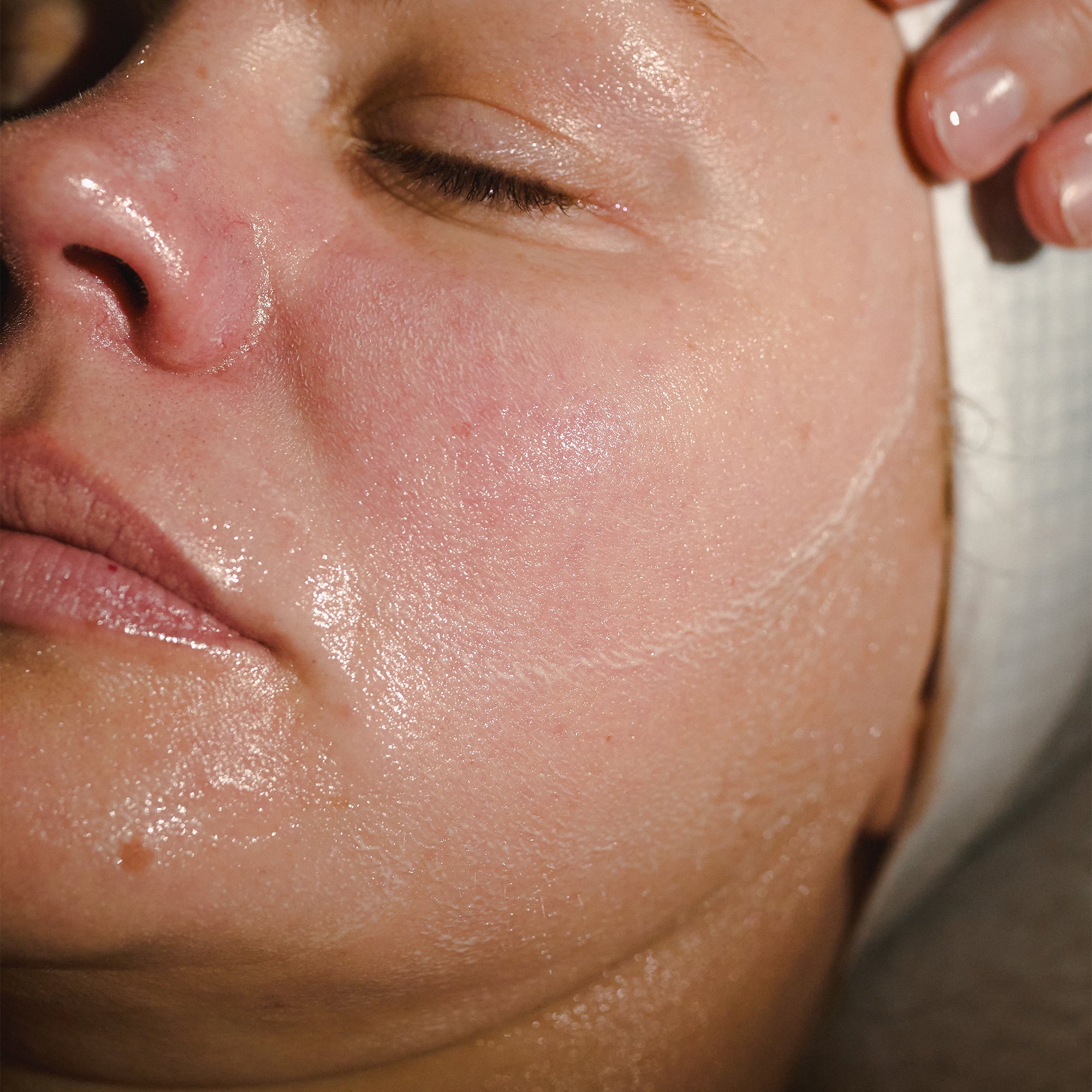 Wet your palms with warm water and rub together to emulsify the oil, creating a milky texture. Using circular motions gently rub into the client’s skin for a few minutes to lift make-up and debris.