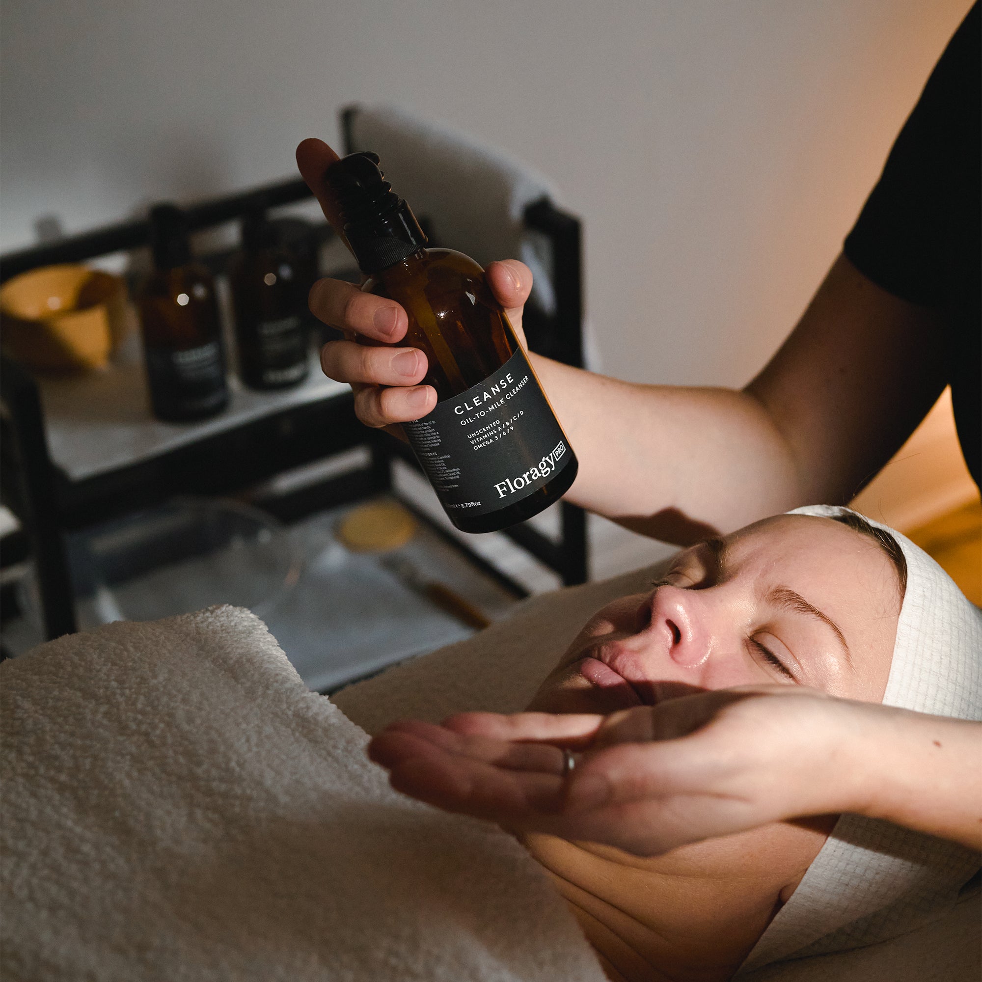 Apply two to three pumps into palms and apply to the client’s face and décolletage. Sweep over the skin using effleurage movements ensuring all areas are covered.